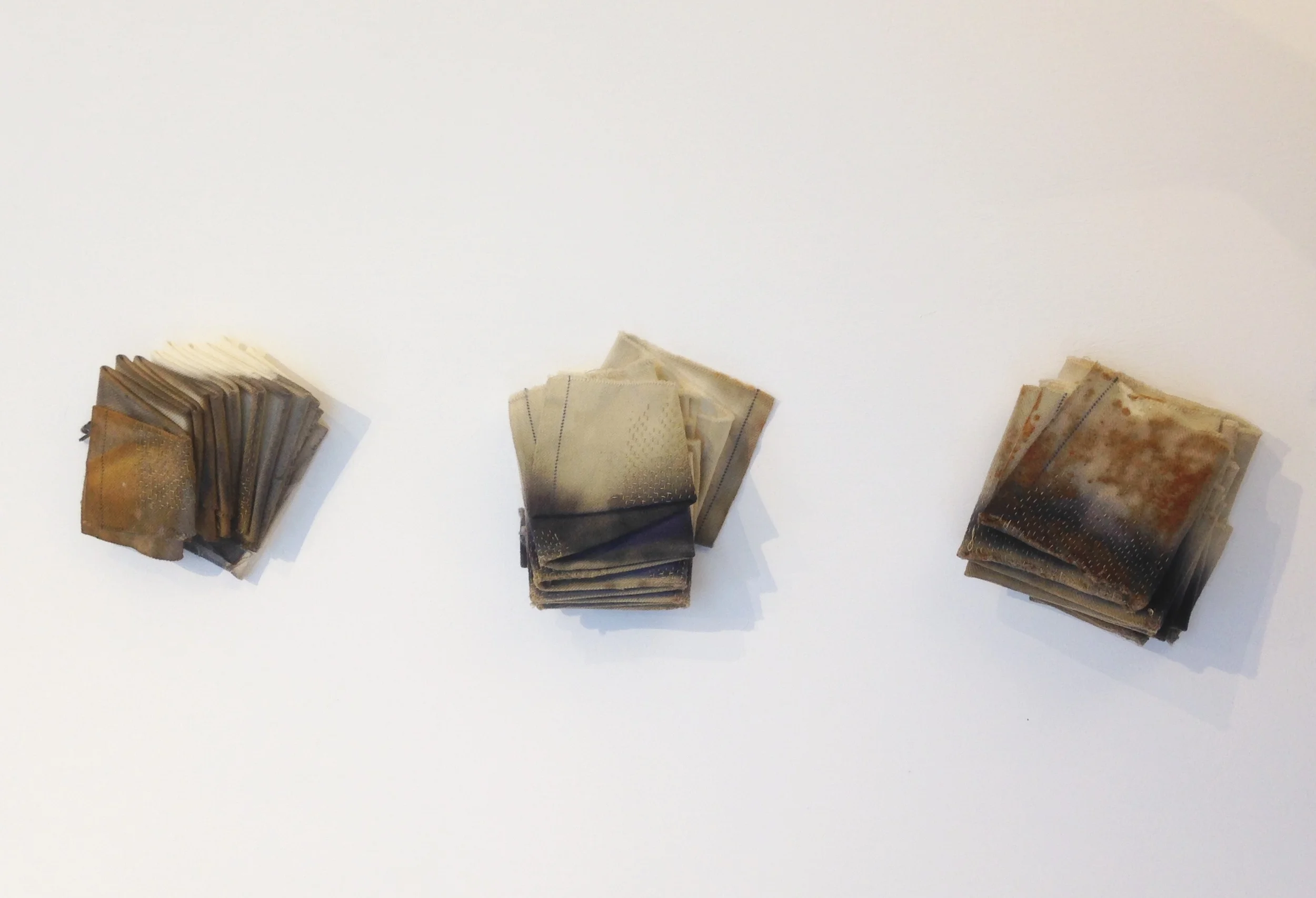 My flyped (or folded) bundles of local worsted cloth have slowly absorbed a traditional black dye and are saddened using an iron mordant. They are heavily stitched along their folded edges. I am using these materials to explore the density of processes that now mostly happen out of view, and the arcane textile language that accompanied them.